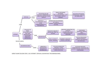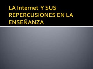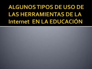 El documento describe el uso de Internet como herramienta educativa. Explica que Internet puede usarse para mejorar el aprendizaje al brindar acceso a una gran cantidad de información y permitir la comunicación y colaboración. También discute algunas ventajas como la motivación de los estudiantes y desventajas potenciales como la falta de control sobre el contenido y la saturación de información.