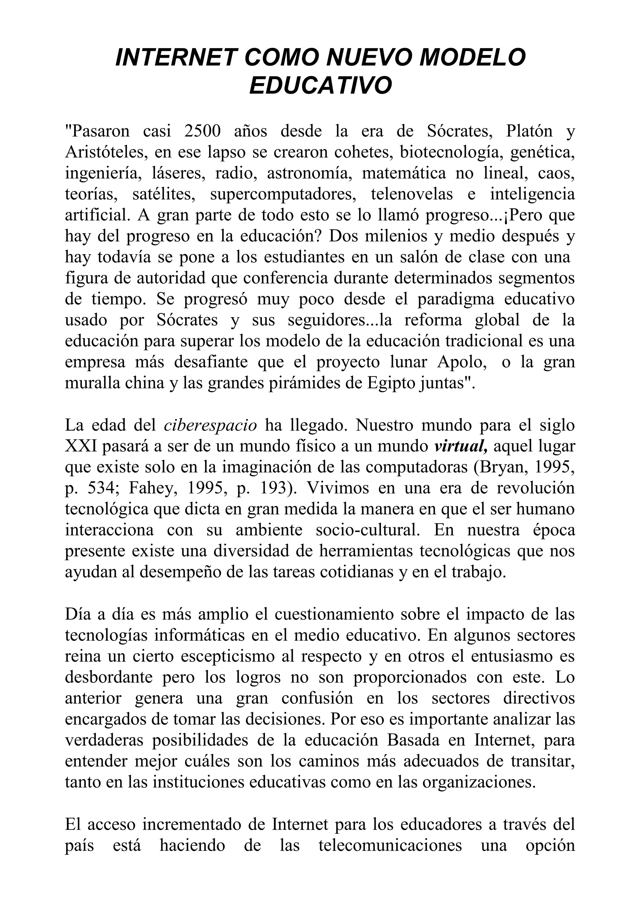 El documento discute los desafíos de la educación tradicional y las oportunidades que brinda Internet como un nuevo modelo educativo. Señala que a pesar del progreso tecnológico, la educación ha cambiado poco en 2500 años. Internet puede transformar la educación haciéndola más interactiva e impulsando un aprendizaje colaborativo y de por vida. Sin embargo, aprovechar su potencial requiere superar limitaciones como la falta de acceso y habilidades digitales de algunos maestros y estudiantes.