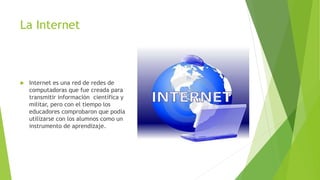 El documento describe cómo Internet fue creada originalmente para transmitir información científica y militar, pero los educadores descubrieron que también podía usarse como una herramienta de aprendizaje para los estudiantes. Internet permite que los estudiantes aprendan a su propio ritmo y les da acceso a bases de datos y publicaciones electrónicas.