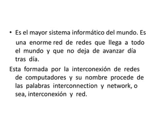 Internet es la mayor red de redes del mundo que conecta computadoras a nivel global y permite la comunicación entre personas a grandes distancias. Se ha convertido en una revolución en las comunicaciones al ofrecer acceso a una gran cantidad de información a cualquier persona conectada. Internet representa una amplia biblioteca digital donde se puede encontrar información sobre casi cualquier tema y ofrece cuatro servicios principales: la World Wide Web, correo electrónico, noticias y transferencia de archivos.