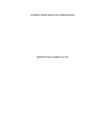 Este documento describe la historia y evolución de Internet desde su creación como ARPANET en la década de 1960 hasta su popularización a nivel mundial en la década de 2000. Explica las ventajas de Internet como un medio de comunicación masivo, como permitir la comunicación global interactiva y el acceso a información actualizada las 24 horas. También compara a Internet con otros medios de comunicación masiva como la televisión, la radio y los periódicos.