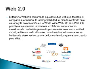 La Web 2.0 permite a los usuarios interactuar y colaborar como creadores de contenido en una comunidad virtual, a diferencia de la Web 1.0 que tenía contenido estático creado para los usuarios. Las características clave de la Web 2.0 incluyen que los usuarios generan contenido, tienen un rol activo al compartir y colaborar, y las interfaces son interactivas.