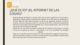 El documento explica el Internet de las Cosas (IoT), que permite conectar una gran variedad de objetos y dispositivos a Internet. Esto permitirá controlar y monitorear estos dispositivos de forma remota para hacer nuestras vidas más cómodas y seguras. Aunque actualmente no es posible conectar todo debido a limitaciones de direcciones IP, la transición a IPv6 eliminará este obstáculo y permitirá la interconexión casi ilimitada de objetos, dando paso a la era del IoT.