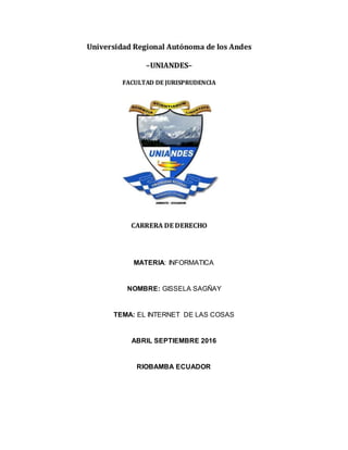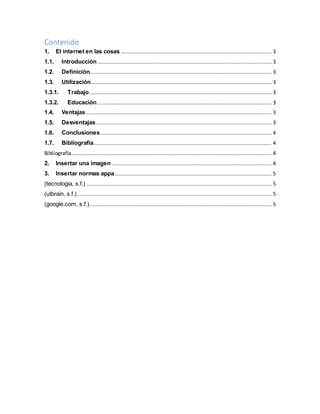 El documento habla sobre el Internet de las Cosas. Define el Internet de las Cosas como la conexión de objetos del mundo real a Internet y la capacidad de estos objetos de recopilar y compartir datos. Explora algunos usos como el control remoto de electrodomésticos y la educación, y discute ventajas como la facilidad de trabajo global y desventajas como la posible adicción.
