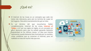 El documento habla sobre el Internet de las Cosas (IoT). Explica que el IoT conecta objetos cotidianos a Internet, permitiéndoles comunicarse globalmente a través de sensores y chips embebidos. Aunque la idea no es nueva y se viene desarrollando desde hace 30 años, el IoT está ganando popularidad recientemente. Todavía no se ha masificado en los hogares pero ya está presente a través de dispositivos como cámaras, termostatos inteligentes y asistentes virtuales.