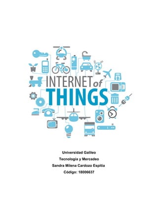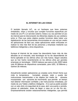 El documento describe el Internet de las Cosas (IoT), que permite la interconexión digital de objetos cotidianos a través de aplicaciones y redes. Explica que para 2020 habrá decenas de billones de dispositivos conectados y menciona aplicaciones existentes como Smart Home. También discute retos como crear plataformas que soporten una gran cantidad de dispositivos y asegurar la privacidad de los usuarios. Finalmente, concluye que el IoT revolucionará la interconectividad y acceso a información, aunque plantea preocupaciones sobre segur