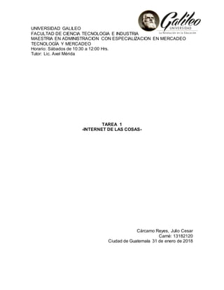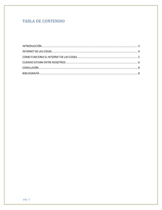El documento explica el concepto de Internet de las Cosas (IoT), cómo funciona a través de sistemas embebidos en objetos que les permiten conectarse a Internet y comunicarse remotamente, y algunos ejemplos actuales de aplicación del IoT en industrias como la manufactura, infraestructura urbana, medio ambiente y salud. Aunque el IoT aún no se ha implementado ampliamente en el hogar, los expertos prevén que revolucionará la forma en que las personas se comunican y interactúan con su entorno.