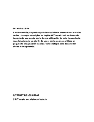 El documento describe el Internet de las Cosas (IoT), que permite que objetos cotidianos se conecten a Internet y compartan datos en tiempo real. Explica que el IoT supone una revolución en las relaciones entre personas, objetos y máquinas, y que permitirá digitalizar el mundo físico. También analiza las aplicaciones del IoT en sectores como la agricultura, la salud y la energía.