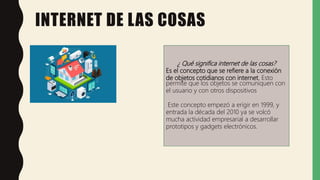 El documento describe el concepto de Internet de las Cosas, que se refiere a la conexión de objetos cotidianos a Internet para que puedan comunicarse con usuarios y otros dispositivos. Esto permite recopilar datos de sensores en objetos y mostrar la información a los usuarios. Algunos ejemplos de tecnologías involucradas incluyen sensores, módulos de comunicación y microprocesadores. Ventajas del Internet de las Cosas son permitir la automatización de procesos, reducir costos y mejorar la satisfacción del cliente.