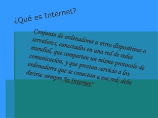 Internet es una red mundial de redes que conecta ordenadores y dispositivos a través de un protocolo común. Ofrece servicios como correo electrónico, transferencia de archivos y chat. Para conectarse se necesita una computadora, un módem, acceso a una línea telefónica, un navegador y una cuenta con un proveedor de internet. Los proveedores brindan el acceso a la red mediante servidores, y cobran tarifas por el tiempo de conexión o planes mensuales.
