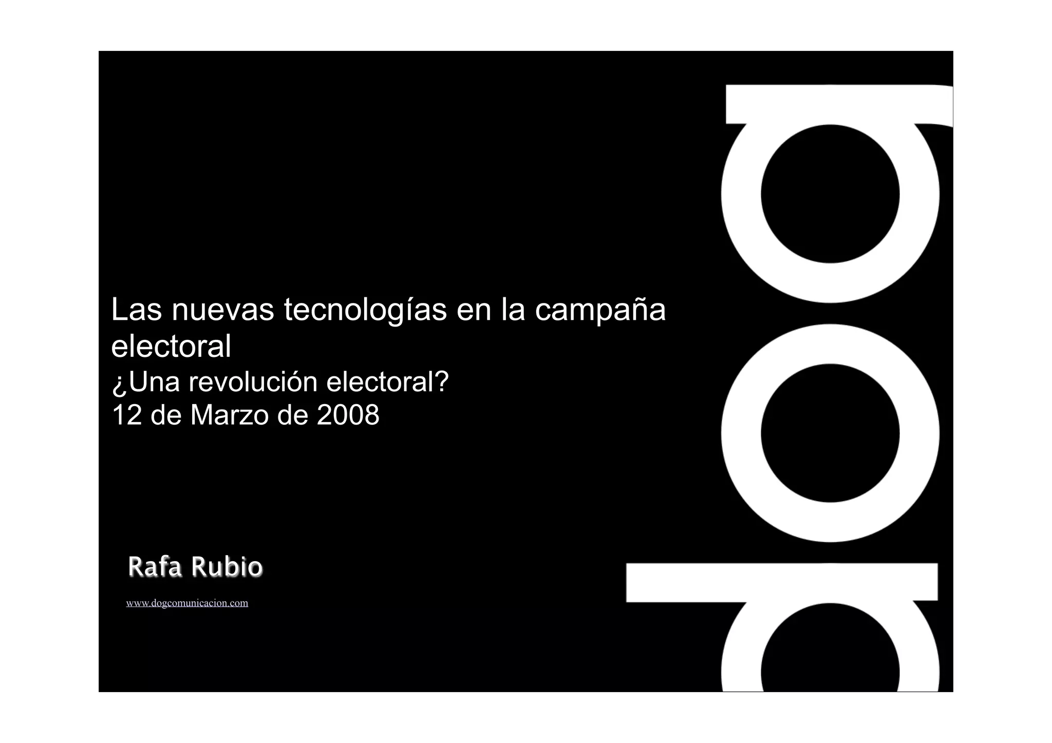 El documento resume el uso de las nuevas tecnologías en las campañas electorales españolas e internacionales. Explica que Internet se ha convertido en una herramienta fundamental para informar, recaudar fondos y movilizar a los votantes y voluntarios. Sin embargo, los partidos españoles aún no aprovechan todo su potencial interactivo y su uso de redes sociales y vídeos es menor que en otros países.