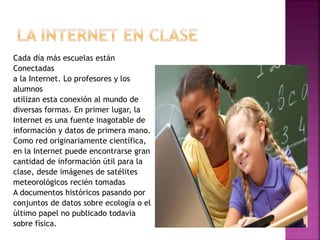 La Internet es utilizada por millones de personas diariamente, incluyendo maestros, estudiantes y autoridades educativas. Cada día más escuelas se conectan a Internet, lo que permite a profesores y alumnos acceder a una gran cantidad de información y datos útiles para las clases. La administración educativa también produce, difunde y consume grandes cantidades de información a través de Internet.