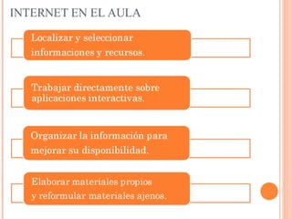El documento aborda cómo los profesores enfrentan el reto de integrar las Tecnologías de la Información y Comunicación (TIC) en el aula, subrayando la necesidad de formación y el uso de Internet para acceder a recursos educativos. Se discuten diversas herramientas y aplicaciones, así como métodos para organizar y compartir información, que facilitan la enseñanza y el aprendizaje. Además, se proponen actividades que los docentes pueden crear fácilmente para involucrar a los estudiantes de manera efectiva.