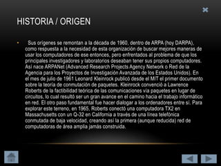 Internet se originó en la década de 1960 como ARPANET, una red creada por el gobierno de EE.UU. para facilitar la comunicación entre investigadores. Desde entonces, Internet ha evolucionado enormemente gracias al crecimiento exponencial de usuarios y servicios como buscadores, descargas y redes sociales.
