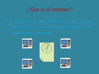 Internet es un conjunto de redes informáticas interconectadas a nivel mundial que permite acceder a una gran cantidad de información desde cualquier ordenador. Ofrece servicios como correo electrónico, páginas web y transferencia de archivos. Aunque proporciona muchas ventajas como acceso rápido e ilimitado a la información, también plantea algunos riesgos como virus, piratería informática y contenidos no deseados. Para conectarse se requiere de un ordenador, línea telefónica, proveedor de internet y navegador web.