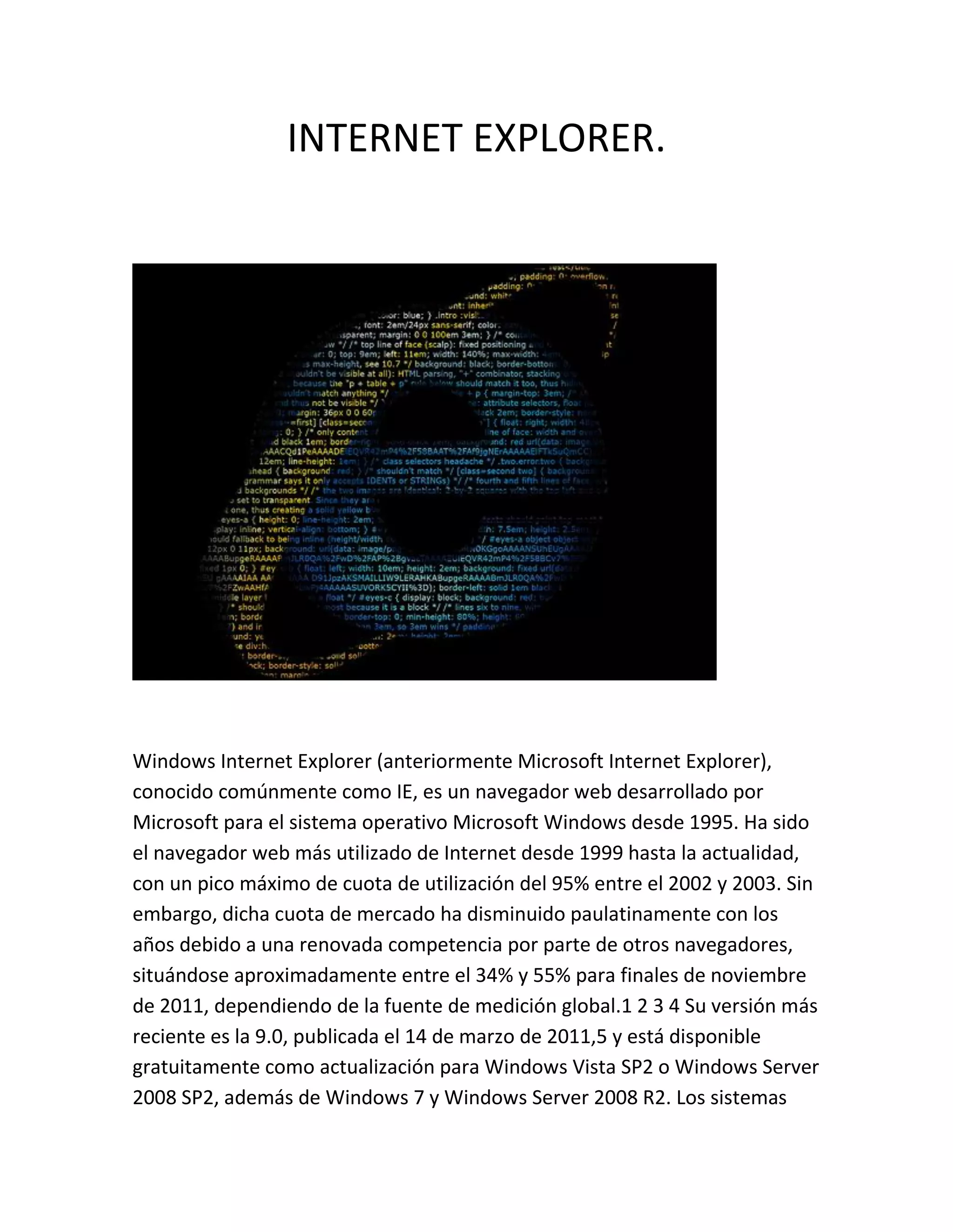 Internet Explorer es un navegador web desarrollado por Microsoft para Windows desde 1995. Fue el navegador más utilizado entre 1999 y 2003 con una cuota máxima del 95%, pero ha ido perdiendo cuota en favor de otros navegadores, situándose entre el 34% y 55% en 2011. Su versión más reciente es la 9.0 lanzada en 2011, disponible gratis para algunas versiones de Windows como Vista y 7.