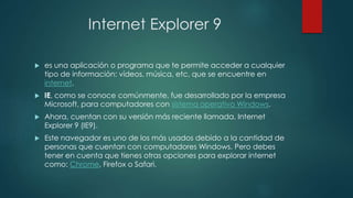 Internet Explorer 9 es un navegador web desarrollado por Microsoft que permite acceder a información en internet como videos y música. El documento describe cómo descargar e instalar Internet Explorer 9, las partes principales de su interfaz como la barra de direcciones, y cómo configurar opciones como la página de inicio, seguridad, historial y aceleradores. También menciona que el control parental permite a los padres restringir el acceso de los hijos a ciertos sitios y aplicaciones en internet.