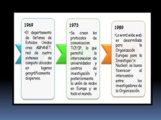 El documento describe la historia de Internet. Comenzó en la década de 1960 como una red militar estadounidense llamada ARPANET. En la década de 1980, la National Science Foundation creó NSFNET, que absorbió a ARPANET y permitió el uso de Internet para fines científicos y académicos. En 1990, Tim Berners-Lee inventó la World Wide Web, permitiendo a las personas acceder e intercambiar información de forma más fácil a través de Internet.