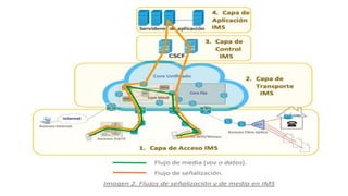 El documento describe la arquitectura IMS (IP Multimedia Subsystem). IMS es un framework que permite la entrega de servicios multimedia a través de IP. Fue definido por el foro 3G.ip en 1999. IMS usa tecnología de conmutación de paquetes para proveer servicios de internet desde cualquier lugar y en cualquier momento con calidad de servicio. Permite servicios multimedia en tiempo real a través de redes IP.
