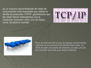 Internet no es sinónimo de la World Wide Web, sino que es un conjunto descentralizado de redes interconectadas que usan protocolos TCP/IP. Una intranet es una red privada dentro de una organización que comparte sistemas de información, mientras que una extranet permite compartir información de forma segura entre una organización y sus proveedores, clientes u otros negocios asociados. Las extranets se diferencian de las intranets e Internet en que la información es restringida y sólo accesible a usuarios autorizados.