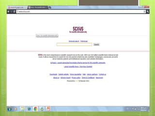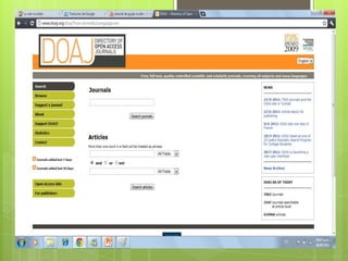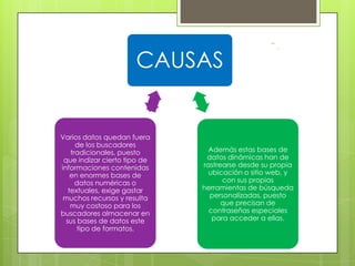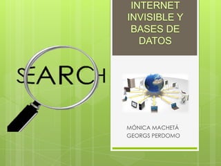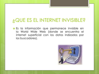 El documento habla sobre la Internet invisible, que es información que permanece oculta en la web profunda y no es indizada por los buscadores. Esta información invisible es 500 veces mayor que la visible y se encuentra en bases de datos como DOAJ y SCIRUS, que almacenan revistas y documentos científicos de libre acceso. DOAJ contiene revistas académicas revisadas por pares, mientras que SCIRUS permite realizar búsquedas avanzadas de información científica y técnica en la web.