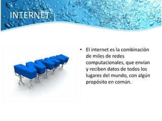 El documento describe cómo el internet se ha convertido en una parte fundamental de la vida diaria de las personas y las empresas al permitir la comunicación y las transacciones de forma más rápida y económica. Explica que el internet ha revolucionado las sociedades con una amplia red de comunicaciones global y cómo su uso ha crecido considerablemente en México, situándose solo por detrás de Brasil en América Latina.
