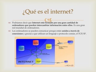 Internet está formado por una red mundial de ordenadores que pueden intercambiar información. Para conectarse a Internet se necesita un navegador, un modem, una conexión y un proveedor de acceso. Internet es fácil de usar, económica y variada.