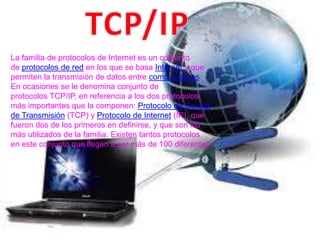 Internet es un conjunto descentralizado de redes interconectadas que utilizan protocolos como TCP/IP para funcionar como una red lógica única a nivel mundial. Sus orígenes se remontan a 1969 con la creación de ARPANET, la primera red de computadoras interconectadas.