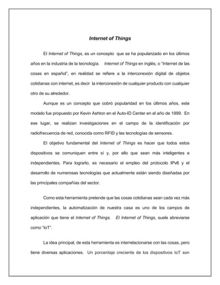 El documento explica el concepto de Internet de las Cosas (IoT), que se refiere a la interconexión digital de objetos cotidianos con Internet. Aunque cobró popularidad recientemente, el modelo fue propuesto en 1999. El objetivo del IoT es que los dispositivos se comuniquen entre sí y sean más inteligentes e independientes. Proporciona ejemplos de aplicaciones como hogares y vehículos inteligentes.