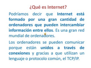 Internet está formado por una red mundial de ordenadores que pueden intercambiar información. Los ordenadores se comunican a través de conexiones y utilizando el protocolo TCP/IP. Para conectarse a Internet se necesita un terminal como un ordenador, una conexión como ADSL, un módem, un proveedor de acceso y un navegador.