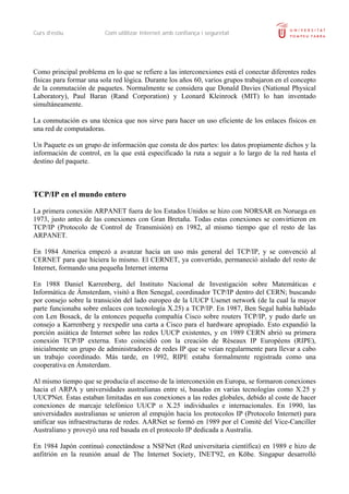 Este documento describe la historia y evolución de Internet desde sus orígenes en las redes de comunicación de los años 1950 hasta la actualidad. Explica cómo las ideas iniciales de conectar computadoras evolucionaron hasta convertirse en la red global que conocemos hoy en día, con hitos como el desarrollo de protocolos como TCP/IP y la World Wide Web. También describe cómo Internet se expandió a nivel mundial y cómo organismos como el IETF han establecido estándares para su funcionamiento.