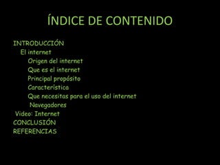 Este documento explica el origen e historia de Internet, cómo surgió como proyecto militar estadounidense llamado ARPAnet en 1969 y cómo se ha convertido en una red global descentralizada. Define Internet como un conjunto de redes interconectadas que usan protocolos TCP/IP para funcionar como una red lógica única. Explica que la World Wide Web es un servicio desarrollado posteriormente que utiliza Internet, y describe los requisitos básicos para conectarse como ordenador, módem, medio de transmisión, navegador y proveedor de
