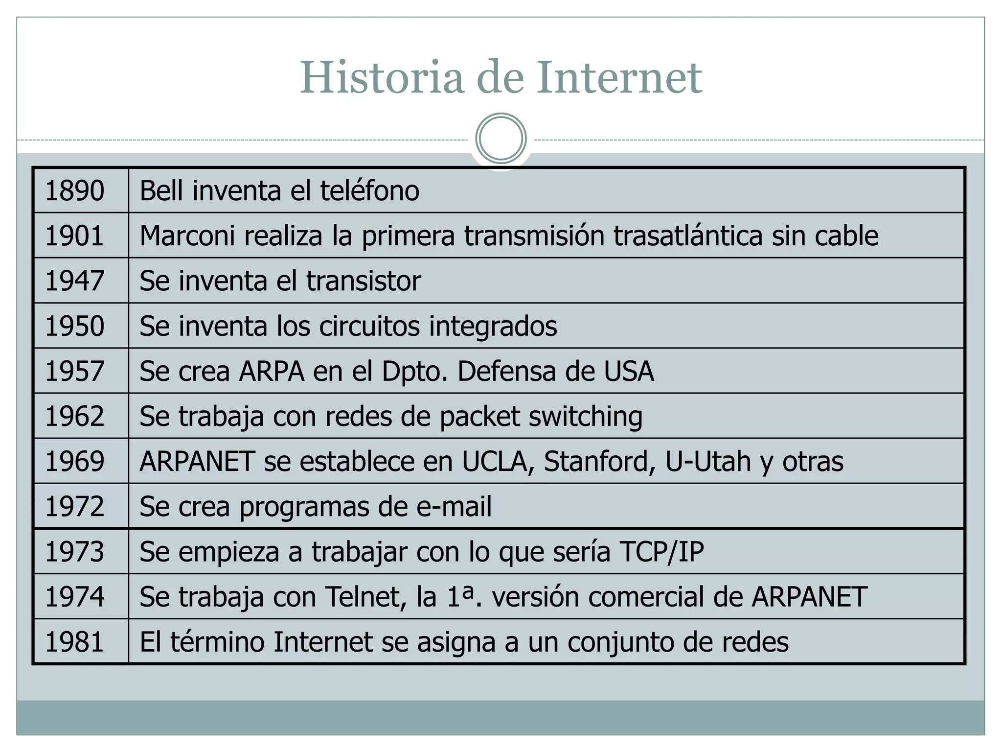 Este documento describe la historia del desarrollo de Internet desde sus inicios en la década de 1890 hasta principios de la década de 2000. Algunos hitos clave incluyen la invención del teléfono en 1890, el desarrollo de ARPANET en la década de 1960, la adopción de TCP/IP como protocolo estándar en 1983, el surgimiento de la World Wide Web en 1991 y el crecimiento exponencial de usuarios de Internet a finales de la década de 1990. El documento también brinda una introducción a conceptos fundamentales como direcciones IP