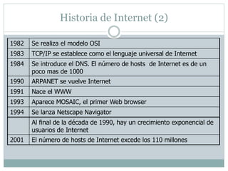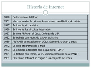 Este documento describe la historia del desarrollo de Internet desde sus inicios en la década de 1890 hasta principios de la década de 2000. Algunos hitos clave incluyen la invención del teléfono en 1890, el desarrollo de ARPANET en la década de 1960, la adopción de TCP/IP como protocolo estándar en 1983, el surgimiento de la World Wide Web en 1991 y el crecimiento exponencial de usuarios de Internet a finales de la década de 1990. El documento también cubre temas como protocolos, direcciones IP, nombres