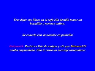 Un policía se hizo pasar por un chico llamado "Meteoro123" en internet para engañar a una niña de 13 años, Verónica, y obtener información personal sobre ella. Usó esta información para encontrarla e identificarla, incluyendo el nombre de su escuela, equipo de hockey y número en su camiseta. Le advirtió a Verónica y sus padres sobre los peligros de compartir detalles personales en línea con extraños para protegerla y enseñarle una lección.
