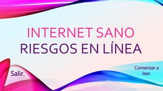 Este documento trata sobre los riesgos en línea y cómo mantener un internet sano. Explica que los riesgos en línea incluyen acoso cibernético, amenazas sexuales y hablar con extraños. Da consejos para adolescentes y niños como proteger su información personal y no confiar en mensajes extraños. También da consejos para padres como monitorear el uso de internet de sus hijos, establecer límites de tiempo y enseñarles a no aceptar invitaciones de desconocidos. El objetivo es crear conciencia sobre los pel