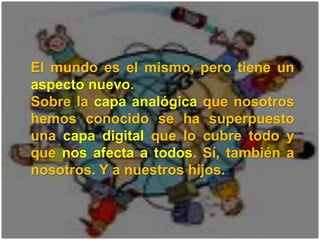 El documento ofrece consejos sobre el uso seguro de Internet para niños y adolescentes. Aborda temas como los riesgos y oportunidades de Internet, cómo proteger el ordenador y los datos personales, formas de comunicación en línea, ciberadicciones y redes sociales para menores. Resalta la importancia de que los padres se involucren en el uso que hacen sus hijos de la tecnología para guiarlos a tomar decisiones seguras y positivas.