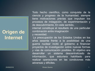 El documento describe el origen e historia de Internet. Se originó en la década de 1960 cuando el gobierno de Estados Unidos financió proyectos para desarrollar una red descentralizada de comunicación que funcionara en caso de una guerra nuclear. Esto llevó al desarrollo de ARPANET y eventualmente la World Wide Web en la década de 1990, permitiendo que cualquier persona con acceso a una computadora e Internet pueda acceder a información de forma instantánea desde cualquier lugar.