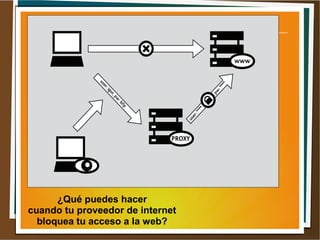 El documento describe cómo configurar la conexión a internet para usar los servidores DNS de Google cuando el proveedor de internet bloquea el acceso o lo ralentiza. Explica cómo cambiar la configuración de DNS en Windows y routers para usar las direcciones 8.8.8.8, 8.8.4.4, 2001:4860:4860::8888 y 2001:4860:4860::8844 de Google en lugar de los servidores del proveedor. También menciona alternativas como OpenNIC que ofrece una lista de 42 servidores DNS públicos gratuitos.