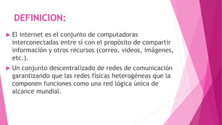 El documento describe la historia, definición, características y componentes necesarios para conectarse a Internet. Explica que la RPC fue creada en 1991 en Perú como una asociación comprometida con el desarrollo de Internet en el país. También recomienda el uso adecuado de herramientas como Creen Leap y Join.me para compartir escritorios de forma remota.