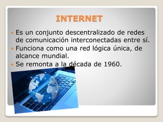 El documento resume brevemente la historia de Internet desde sus inicios en la década de 1960 como una red descentralizada de computadoras interconectadas, el desarrollo del correo electrónico y la red ARPANET en los años 1960 y 1970, el modelo TCP/IP y las redes BITNET y Usenet en los años 1980, el surgimiento de los navegadores web y el World Wide Web en la década de 1990, y el auge de motores de búsqueda como Google y sitios de compartir videos como YouTube desde finales de los 1990 en adelante.