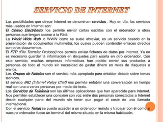Este documento describe los principales servicios de Internet como el correo electrónico, la World Wide Web, FTP, grupos de noticias, IRC y servicios de telefonía. También discute las ventajas de Internet para las empresas como acceder a nuevas tecnologías, conocer a competidores y clientes, mejorar la comunicación interna y reducir costos.
