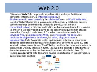 La Web 2.0 se refiere a sitios web que facilitan el intercambio de información y la colaboración entre usuarios para generar contenido. A diferencia de los sitios web estáticos de la Web 1.0, la Web 2.0 permite a los usuarios interactuar y colaborar como creadores de contenido en comunidades virtuales. Ejemplos de la Web 2.0 incluyen wikis, blogs, redes sociales y servicios de alojamiento de videos donde los usuarios tienen un rol activo en la creación y edición de contenido.