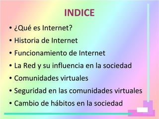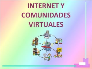 Este documento describe Internet y las comunidades virtuales. Explica que Internet es una red mundial de ordenadores conectados que permite compartir información. También describe cómo se han desarrollado las comunidades virtuales como foros, blogs, redes sociales y más para que las personas se comuniquen e interactúen online. Además, ofrece consejos sobre cómo mantener la seguridad personal en las comunidades virtuales.