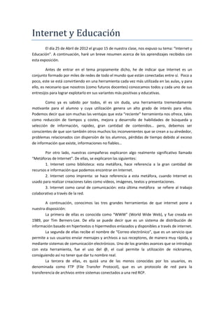El documento resume una presentación sobre el tema de Internet y Educación. Explica que Internet es una herramienta útil pero que también tiene inconvenientes. Describe tres estrategias didácticas para usar Internet en el aula: la caza del tesoro, los webquests y los proyectos telecolaborativos. Finalmente, habla sobre el plan "Internet en el aula" y la necesidad de un uso moderado de las herramientas online para complementar pero no reemplazar la enseñanza tradicional.