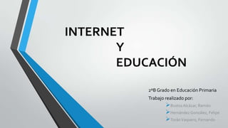 El documento describe las ventajas e inconvenientes del uso de Internet en la educación. Explica que Internet permite un acceso fácil a la información y potencia el desarrollo de habilidades de los estudiantes. También describe herramientas educativas como la caza del tesoro, las webquests, el e-learning y wikis. Concluye que Internet es tan necesario como los libros en la escuela y permite nuevas formas de aprendizaje individual y colaborativo.