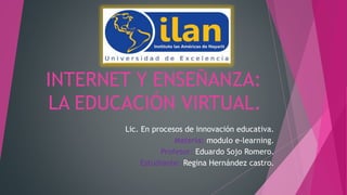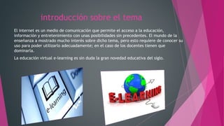 El documento describe el impacto de Internet y la educación virtual (e-learning) en la enseñanza. Explica que Internet proporciona acceso sin precedentes a la educación y la información, y que el e-learning es la nueva forma de educación a distancia que utiliza recursos en línea. También discute las ventajas del e-learning, como la flexibilidad y la capacidad de los estudiantes para dirigir su propio aprendizaje, así como los desafíos, como la pasividad y los problemas técnicos.