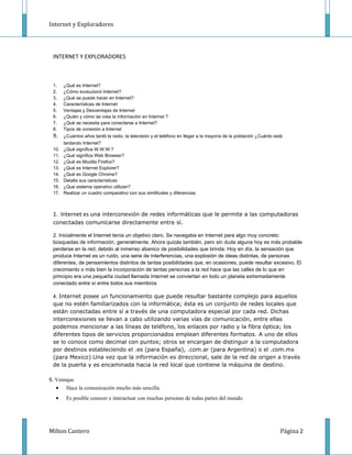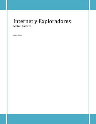 El documento proporciona información sobre Internet y los navegadores web. Explica qué es Internet, cómo evolucionó y las características de su funcionamiento. También describe los principales navegadores como Mozilla Firefox, Internet Explorer y Google Chrome, comparando sus características, similitudes y diferencias. Además, analiza los requisitos para conectarse a Internet y los diferentes tipos de conexión, así como las ventajas y desventajas de usar la red.