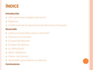 Internet y la escuela trata sobre el uso de Internet en la educación. Explica que Internet ofrece acceso a mucha información y recursos educativos que pueden usarse de manera alternativa a la enseñanza tradicional. Se discuten los papeles del docente y el alumno, así como actividades como las WebQuest y videos educativos en Internet. Finalmente, concluye que la escuela debe incorporar las tecnologías de la información y comunicación de manera que Internet apoye el aprendizaje de manera atractiva y motivadora para los estudiantes.