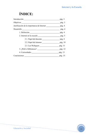 Este documento discute el tema de Internet y la escuela. Explica que Internet surgió como una red militar estadounidense y ahora es una red global que conecta computadoras. El documento explora cómo Internet puede usarse como una herramienta educativa valiosa si se implementa correctamente en las aulas, pero también reconoce los posibles riesgos si no se usa de manera responsable. El papel del maestro y el alumno con respecto a Internet en la escuela también se analiza. Finalmente, el documento concluye que Internet puede contribuir al aprend